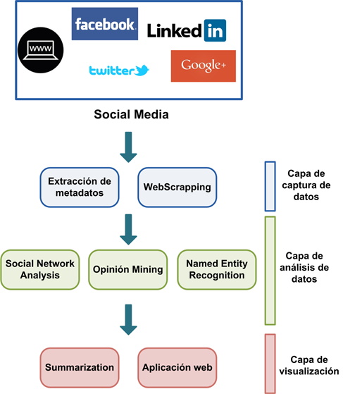 Este a su vez podrá ser usado, utilizando técnicas de Social Network Analysis, para identificar a los principales responsables de formar las opiniones y difundirlas, así como descubrir cuáles son las comunidades de usuarios que se generan de manera dinámica alrededor de dichas comunidades. Por otro lado también se puede analizar el contenido de las opiniones con diferentes técnicas de procesado del lenguaje natural. Algoritmos de Sentiment Analysis y Opinion Mining pueden ser usados para identificar los diferentes componentes de las opiniones y asignarles una polaridad, para de esta manera poder evaluar automáticamente dichas opiniones. Técnicas de NER (Named Entity Recognition) pueden ser utilizadas para identificar a los elementos mencionados en las opiniones. El NER es una subtarea de la recuperación de información que trata de identificar y clasificar entidades singulares en texto sobre categorías predefinidas como nombres de personas, organizaciones, localizaciones, expresiones de horas, cantidades, valores monetarios, porcentajes… Una vez identificadas las entidades podrán ser enlazadas con datasets de Linked Open Data, para de esta manera poder identificarlas unívocamente.